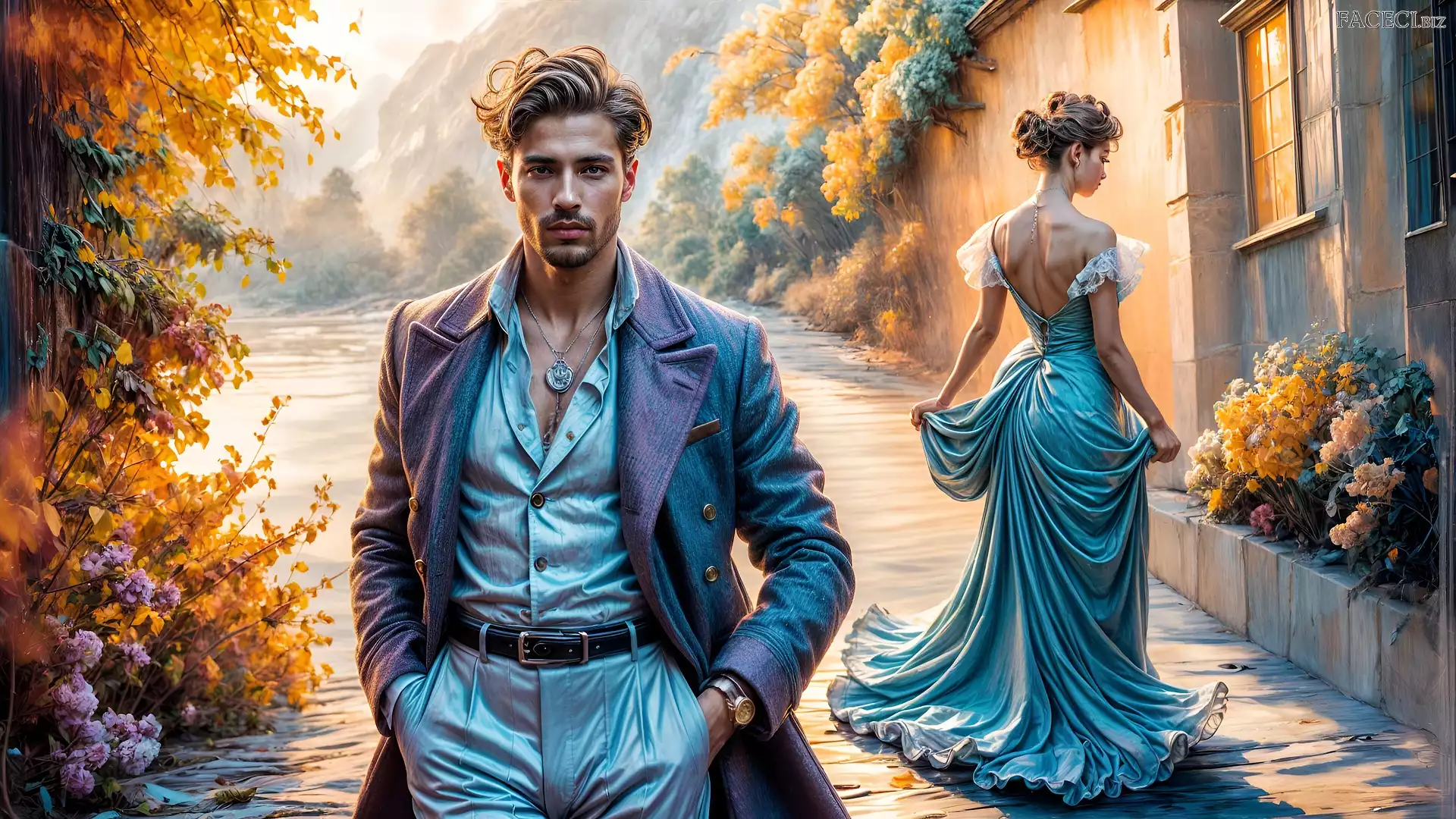 Jesień, Dom, Grafika, Mężczyzna, Kobieta - faceci.biz